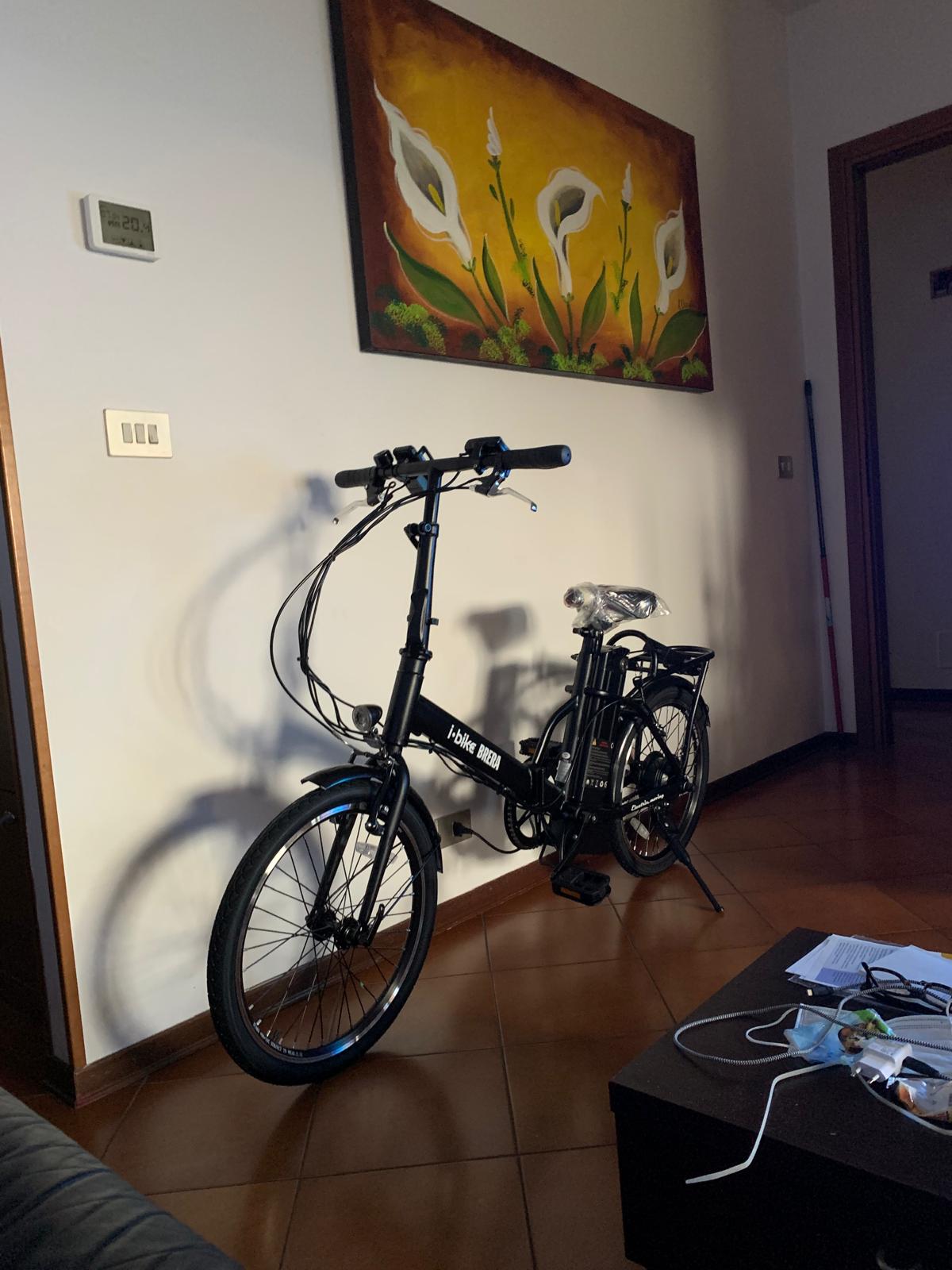 bici nera con ruote 20 con pedali richiudibili Con ruote antiforatura .