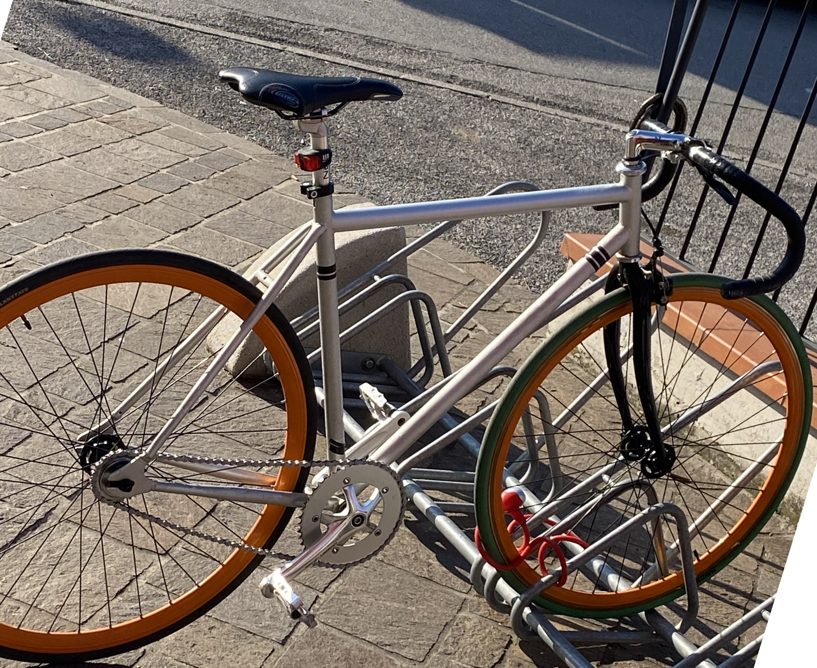 Aveva il manubrio da corsa ma poco tempo fa l’ho cambiato con uno più alto con scotch Cinelli, solo freno posteriore, cerchioni arancione gomme verdi