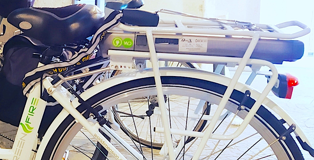 bici elettrica, telaio da donna, forcella anteriore ammortizzata, due specchietti al manubrio, cestino nero davanti