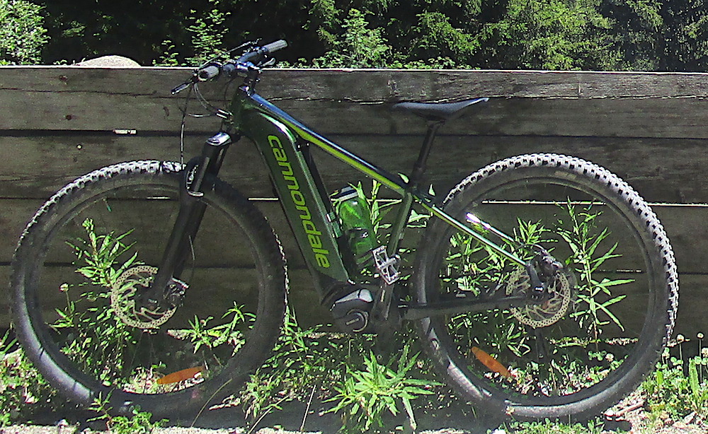 bici elettrica (pedalata assistita), telaio nera con la scritta CANNONDALE in verde, forcella anteriore ammortizzata, freni a disco