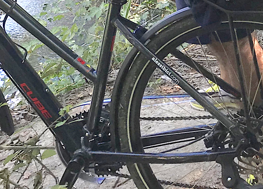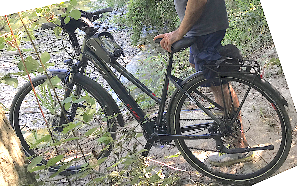 Bici nuova (2020-09), telaio da donna nera opaca con scritta CUBE in rosso, forcella anteriore ammortizzata, freni a disco, parafanghi, cavalletto posteriore, adesivo Alessi Bike