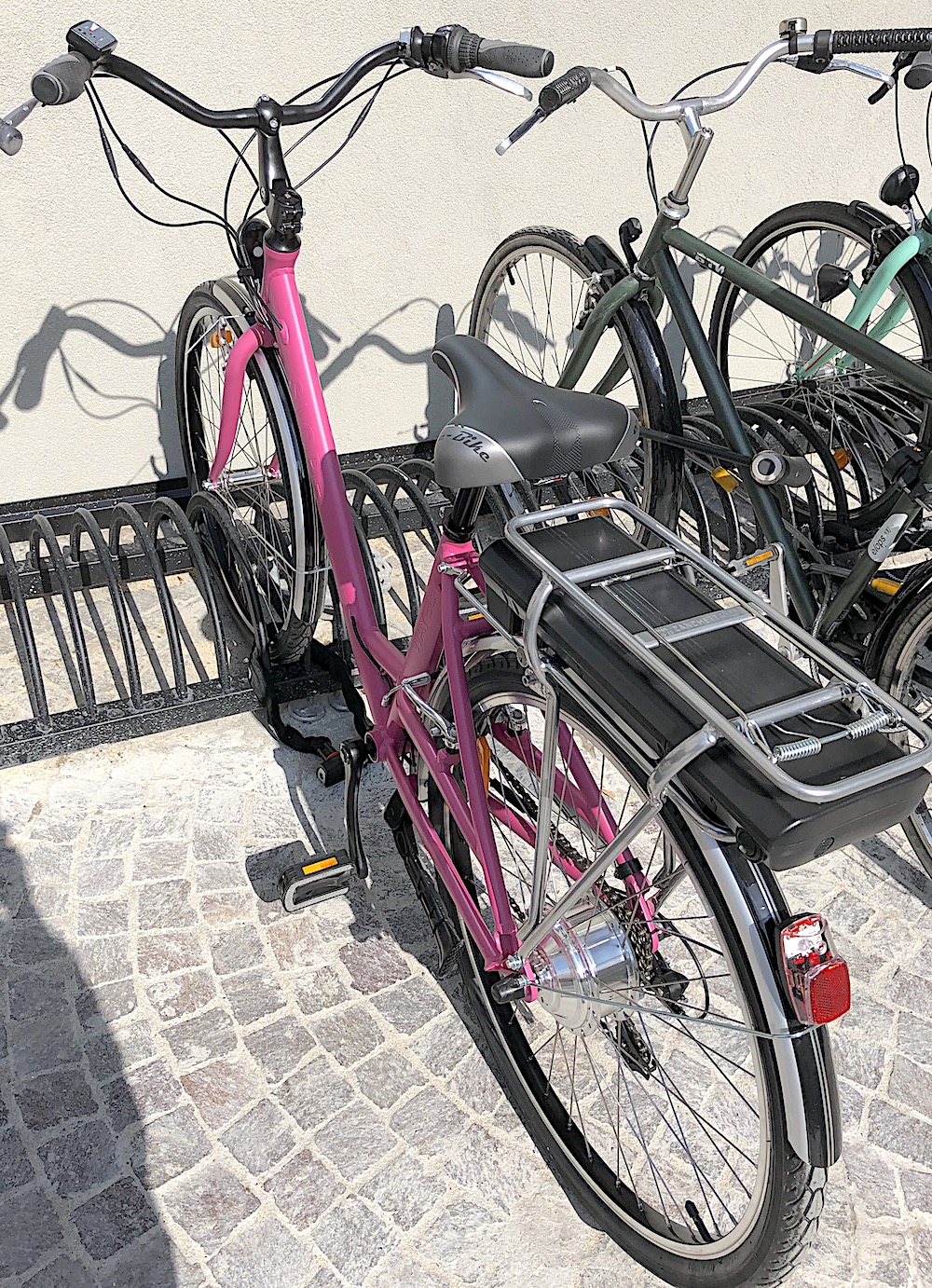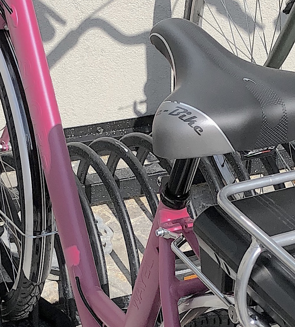 Bici elettrica, telaio da donna colore rosa con le scritta WAYEL e SLOPE in rosa.