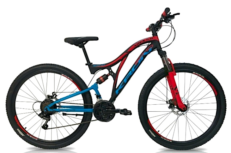 Mountain bike nuova (2020-09), telaio nero blu e rossa con ammortizzatore centrale, forcella anteriore rossa ammortizzata, freni a disco, cambio 21v