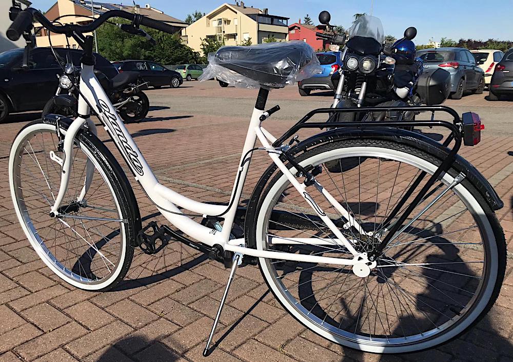 city bike da donna, telaio bianco con scritta OLANDA in nero e bianco, parafanghi neri, portapacchi posteriore nero, cavalletto, gomme nere con striscia bianca