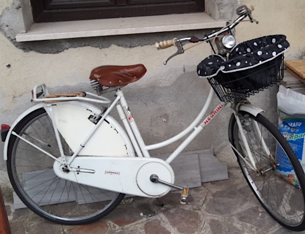 descrizione / segni particolari: vecchia city bike da donna, telaio bianco con scritta NEGRINI in rosso, carter chiuso, parafanghi, portapacchi posteriore piccolo e particolare, sellino marrone a molla, manopole bianche, cestello nero anteriore, dinamo alla ruota anteriore