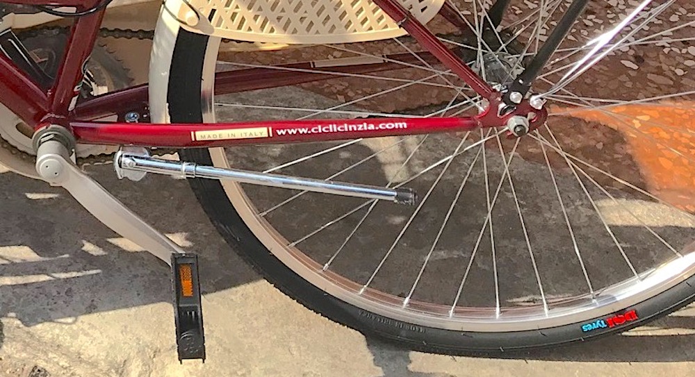 City bike da donna nuova (2020-08); Senza cambio; Telaio bordeaux con inserti bianchi e la scritta CINZIA in nero; Sellino, manopole e parafanghi bianchi; Due portapacchi neri;
