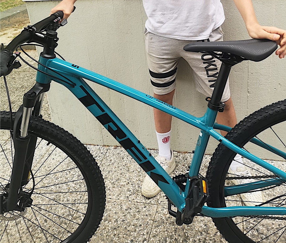 Mountain bike con telaio colore celeste / turchese, scritte TREK in nero, forcella anteriore ammortizzata, freni a disco