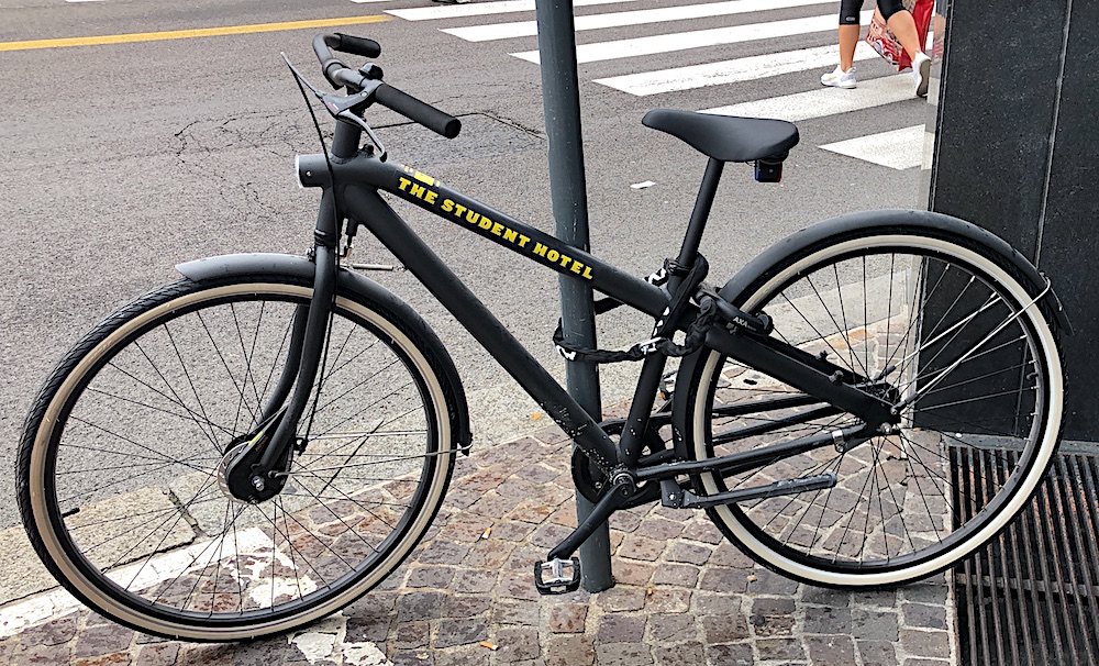 descrizione / segni particolari: Bici particolare marca VanMoof modello F6 prodotta in Olanda e acquistata in gruppo e proprieta dallo Student Hotel Bologna; Telaio nero opaco con adesivi THE STUDENT HOTEL in giallo (possibilmente rimossi o coperti), freno particolare marca Shimano Nexus all'interno del mozzo ruota anteriore, freno posteriore a contropedale, sistema bloccaruota posteriore con catena di sicurezza integrato (di serie) e di marca AXA, copertoni neri con striscia larga bianca, parafanghi colore nero opaco, luce anteriore integrata nel telaio, luce posteriore sotto sellino, manubrio nero piatto, cavalletto nero, cerchi e raggi neri
