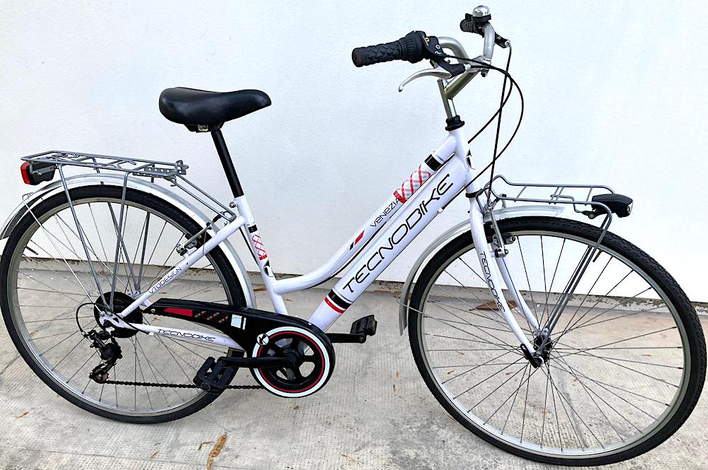 City bike da donna con cambio, telaio bianco, con le scritte TECNOBIKE e VENEZIA in nero, due portapacchi