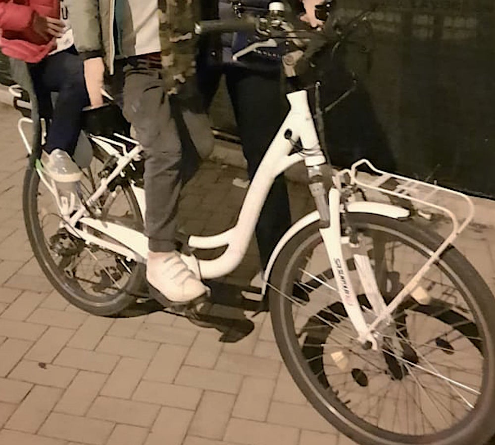 Bici elettrica da donna bianca con seggiolino bimbo con interno verde mela