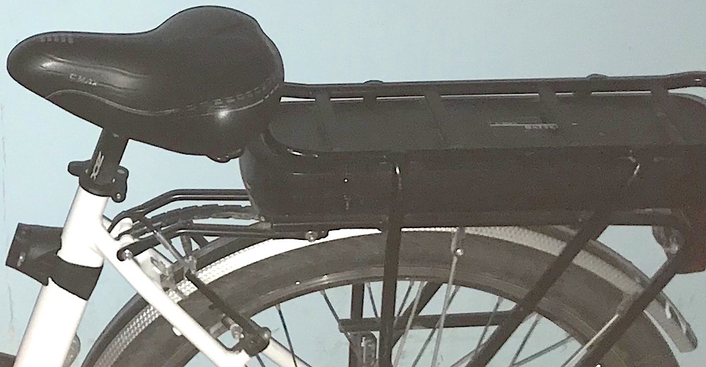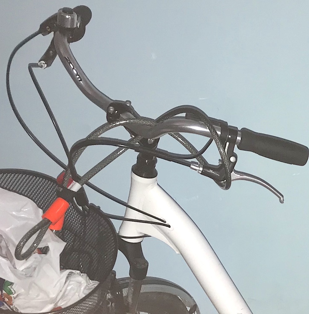 descrizione / segni particolari: bici elettrica con cambio posteriore, telaio bianco senza scritte di marca, due portapacchi neri, forcella anteriore ammortizzata, sella nera con scritta CMAX, manubrio e reggisella marca ZOOM, cestino anteriore di colore nero, leve freni marca SACCON, batteria sotto il portapacchi posteriore, cerchioni neri, parafanghi grigi con linee nere quello posteriore con adesivo "21", supporto su tubo sella per lucchetto Kryptonite