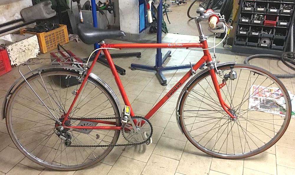 descrizione / segni particolari: Vecchia city bike da uomo, telaio rosso / arancione con la scritta COSMOS, cambio posteriore con leva sul tubo diagonale, manubrio tipo condorino, catena a vista. porta pacchi posteriore, luce a dinamo, cavi bianchi, cavalletto, pedali bianchi