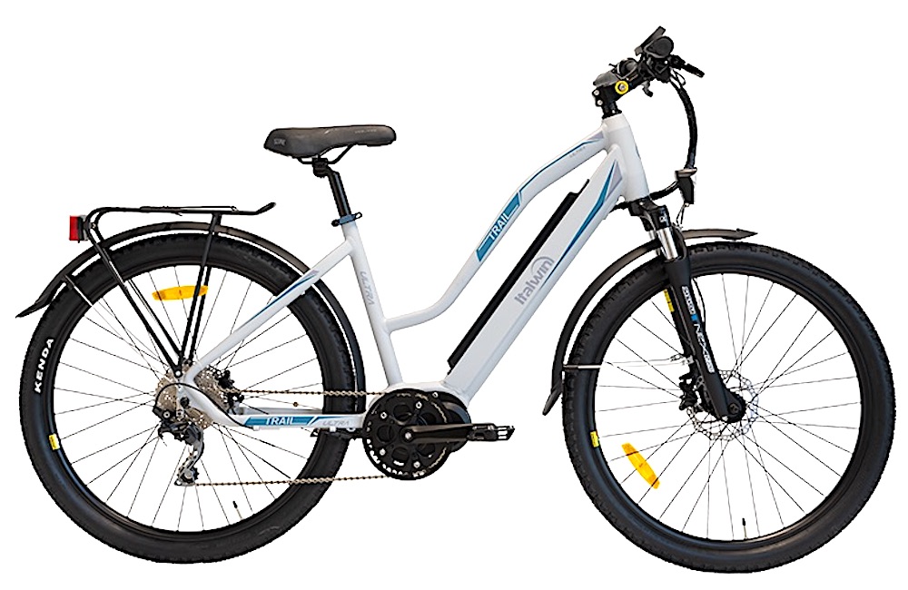 Bici elettrica nuova dotata di batteria e cavalletto, colore grigio chiaro (quasi bianco).