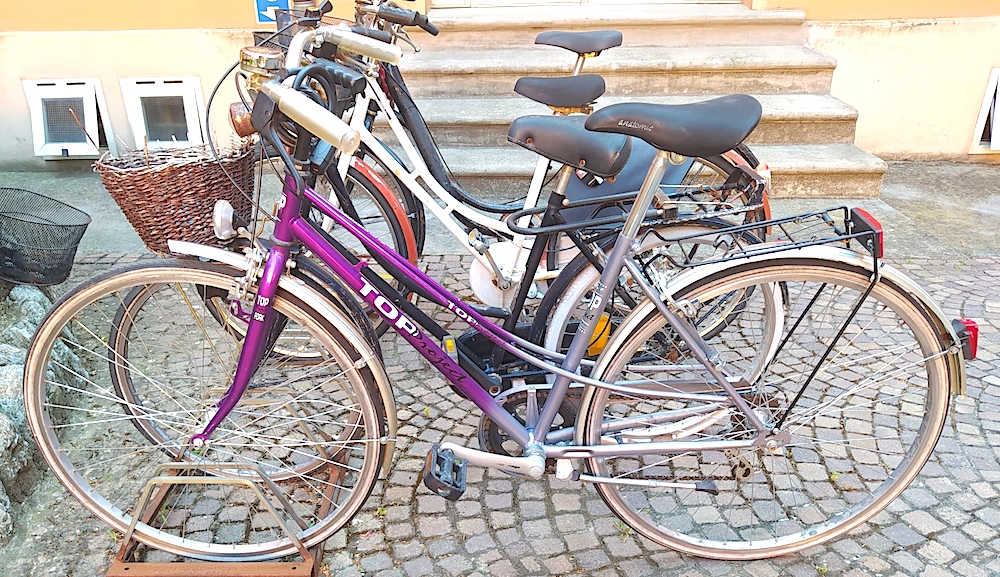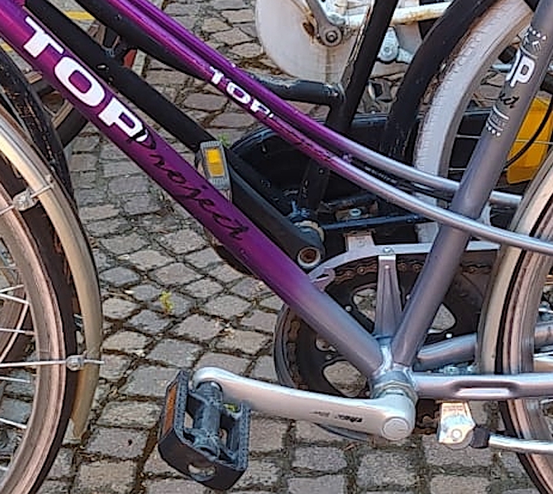 descrizione / segni particolari: City bike da donna con telaio tipo mixte (doppio tubi sottile) colori viola e argento con scritta TOP PROJECT, carter argento, parafanghi, manopole di gomma chiara, campanello grande in metallo, cavalletto, portapacchi posteriore
