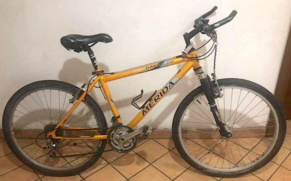 descrizione / segni particolari: Mountain bike, telaio giallo con le scritte MERIDA e DAKAR 660 in nero, forcella anteriore nera ammortizzata, portaborraccia nera, adesivo "Ride The Revolution" sulla canna, adesivo a forma di hashtag con scritta "bike like this"
