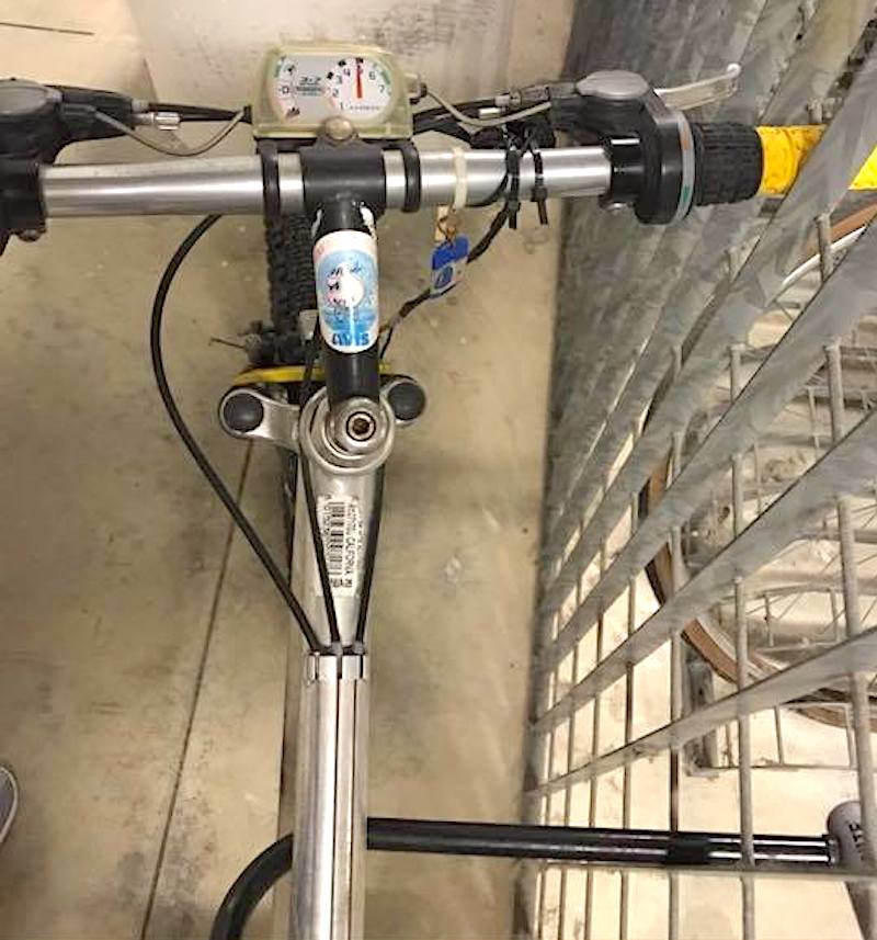 mountain bike, telaio tutto argento senza scritte di marca, forcella anteriore gialla ammortizzata, attacco manubrio nero, manopole gialle