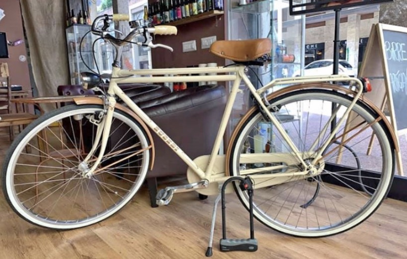 descrizione / segni particolari: city bike da uomo senza cambio, telaio beige particolare per i doppi tubi superiori e con la scritta EUSEBI in marrone, cavo freno posteriore che passa all'interno del telaio, ruote da 28", copertoni neri con striscia bianca, bloccaruota posteriore, carter chiuso, parafanghi colore marrone, monopole beige, portapacchi posteriore, campanello grande in metallo, sellino marrone a molla