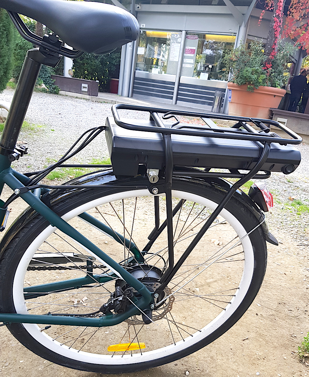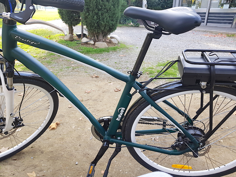 Bici elettrica, telaio verde con le scritte ITALWIN e PRESTIGE2 in bianco, forcella anteriore bianca ammortizzata, freni a disco, cerchi colore bianco,