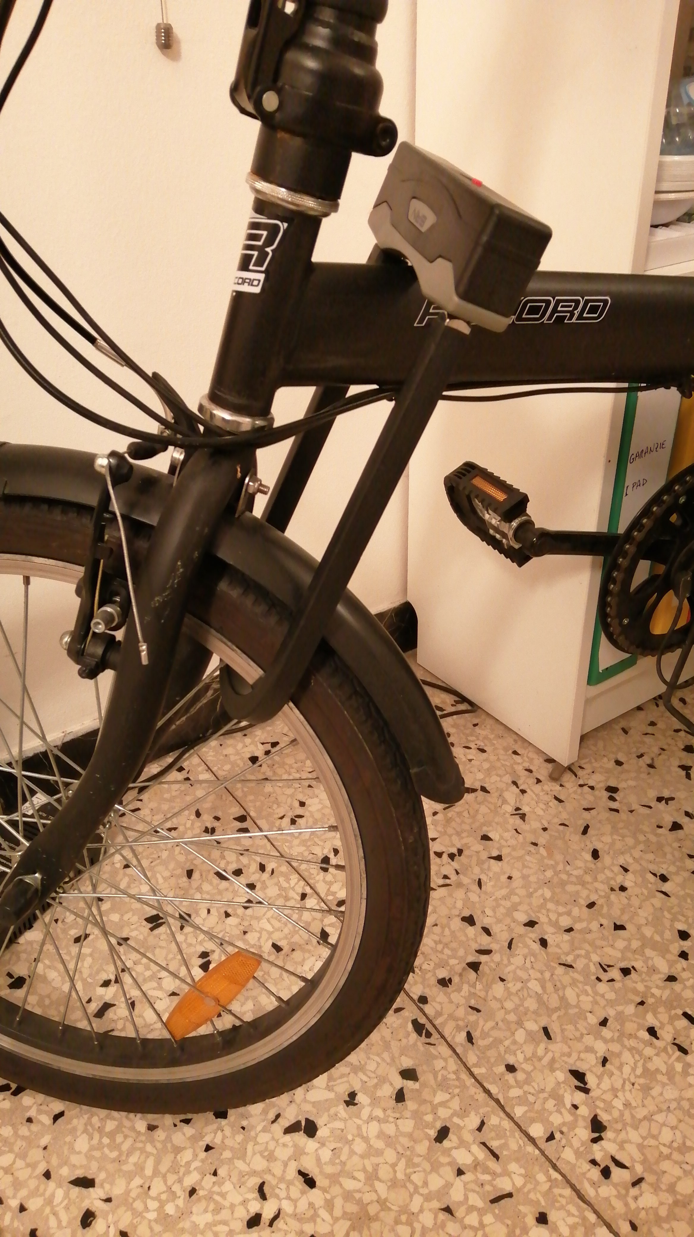 Bici con ruote piccole, campanello rosso, manca catarifrangente anteriore (perché rotto), rubata senza sellino