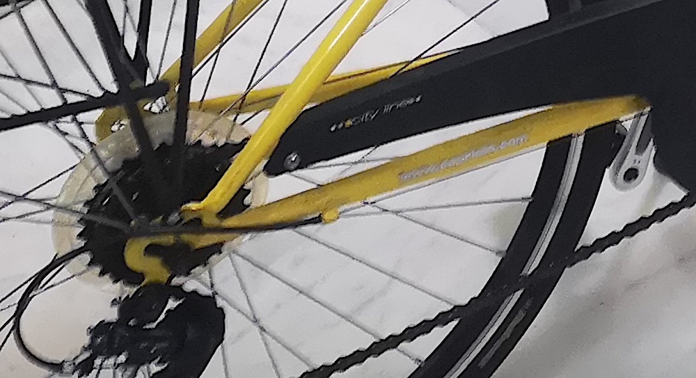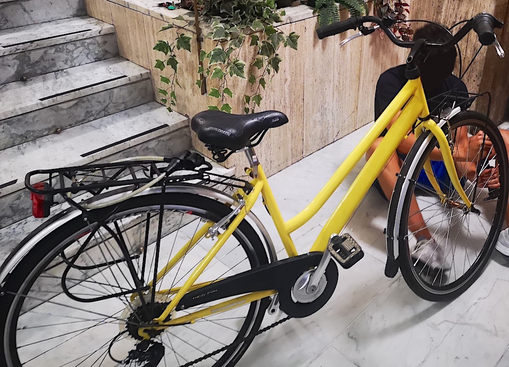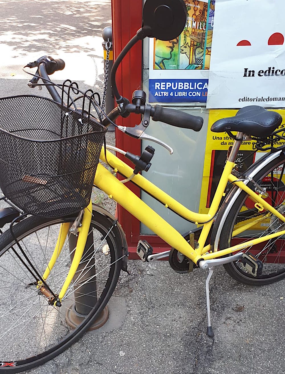 descrizione / segni particolari: City bike da donna con cambio, telaio tutto giallo senza scritte di marca, carter catena nero con la scritta City Line, parafanghi argento e nero, sella nera a molla, portapacchi posteriore del tipo per borse laterale, specchietto sul lato sinistro del manubrio, portapacchi e cestino anteriore, cerchioni neri, mozzo anteriore colore rame