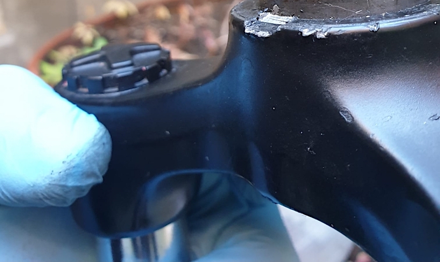 Telaio nero con adesivi rossi, gomme marca Schwalbe Big Apple, ruota elettrica anteriore marca iMortor, forcella cambiata non originale, sella e manubrio bianco, seggiolino bimbo