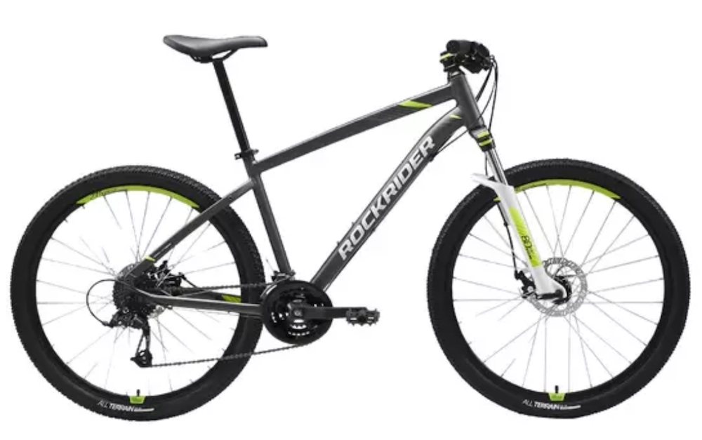 mountain bike nuova, telaio argento, forcella anteriore ammortizzata, freni a disco