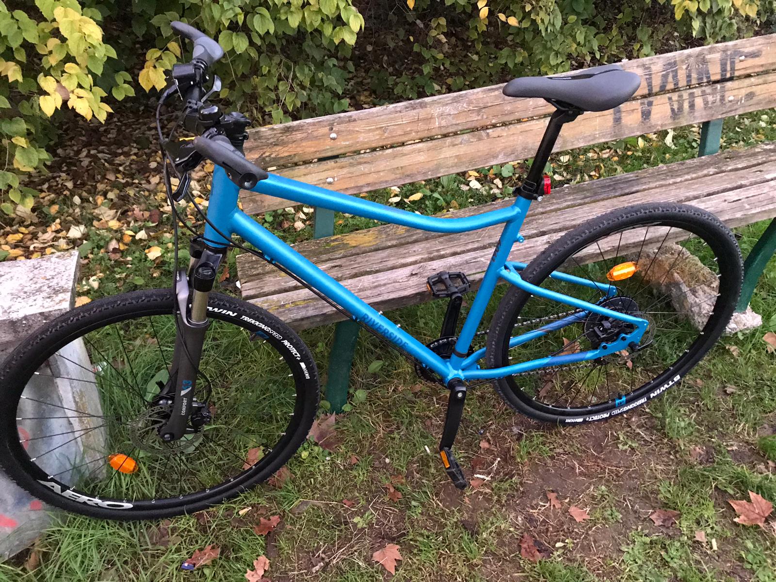 City bike nuova, telaio unisex colore blu con la scritte RIVERSIDE sul tubo obliquo, forcella anteriore ammortizzata, freni a disco, manopole ergonomiche con estensioni, foto è della bici rubata