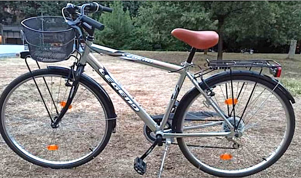 city bike da uomo con cambio, telaio argento con la scritta LEGEND in bianco, attacco e manubrio neri, parafanghi neri, sellino rosso, due portapacchi neri, cestino anteriore