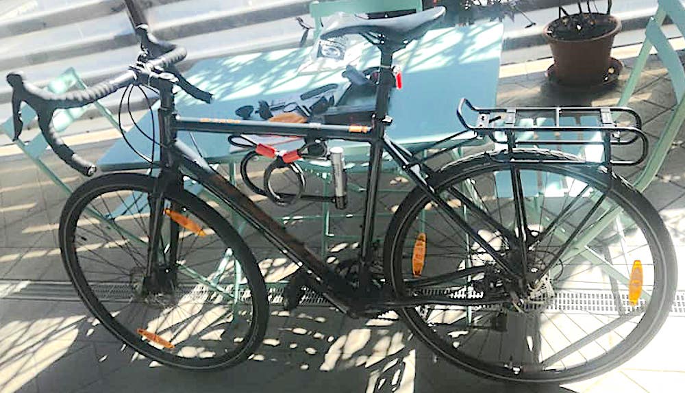 descrizione / segni particolari: Bici da corsa / gravel, telaio da uomo colore grigio scuro con le scritte KONA colore arancio, freni a disco, portapacchi posteriore con borse Decathlon, supporto per u-lock sul tubo superiore, adesivi Mediterranea e Hic Sunt Leones Football Antirazzista