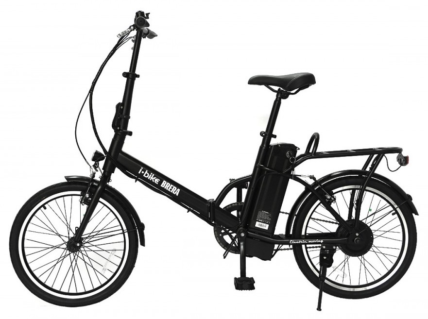 Pieghevole elettrica marca BRERA modello i-Bike, colore nero, parafango anteriore spaccato in 2, quindi è rimasto solo metà parafango, e in più era attaccato al manubrio un porta cellulare con un nastro adesivo.