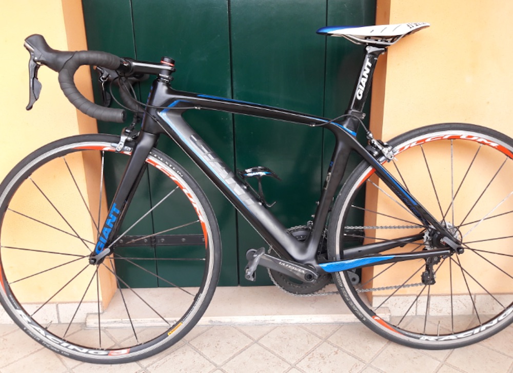 Bici da corsa, telaio in carbonio colore nero / grigio scuro con le scritte GIANT in argento e blu, ruote marca Fulcrum, attacco manubrio Kross, sella bianca marca Specialized, componenti Shimano Ultegra