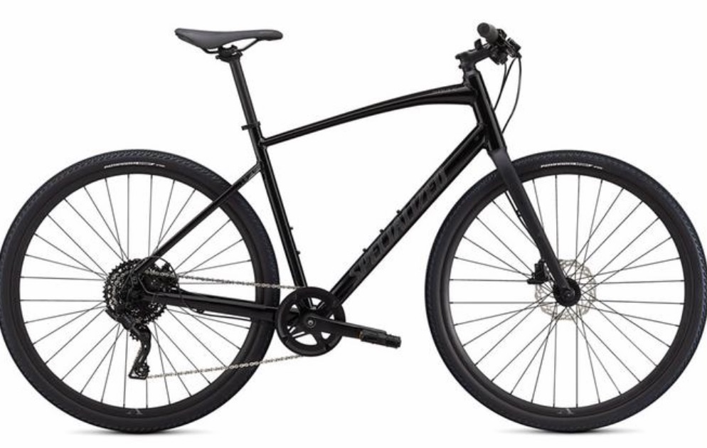 City bike / ibrida, telaio nero, scritta SPECIALIZED in grigio scuro, freni a disco