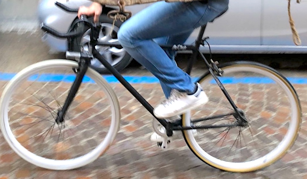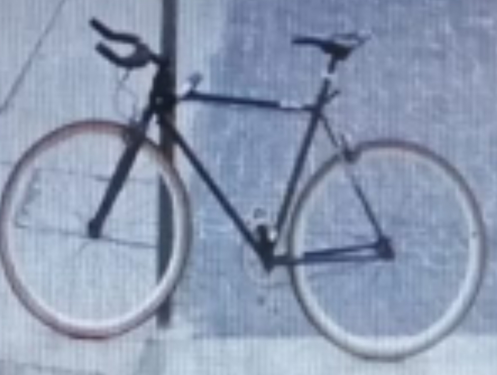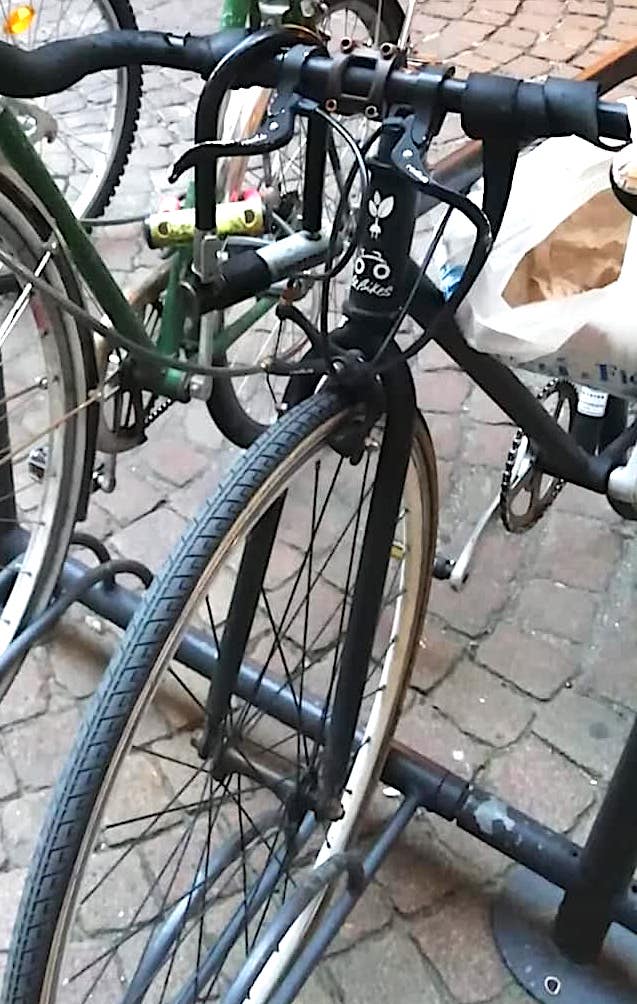 Telaio di taglia piccola (49-50cm) tutto nero con la scritta BiBikes in bianco, manubrio tipo bullhorn con la parte sinistra difettosa, ruote sottili, pedali diversi l'uno dall'altro,
