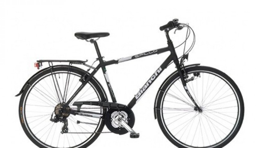City bike, telaio nero opaco, campanello giallo al manubrio DX