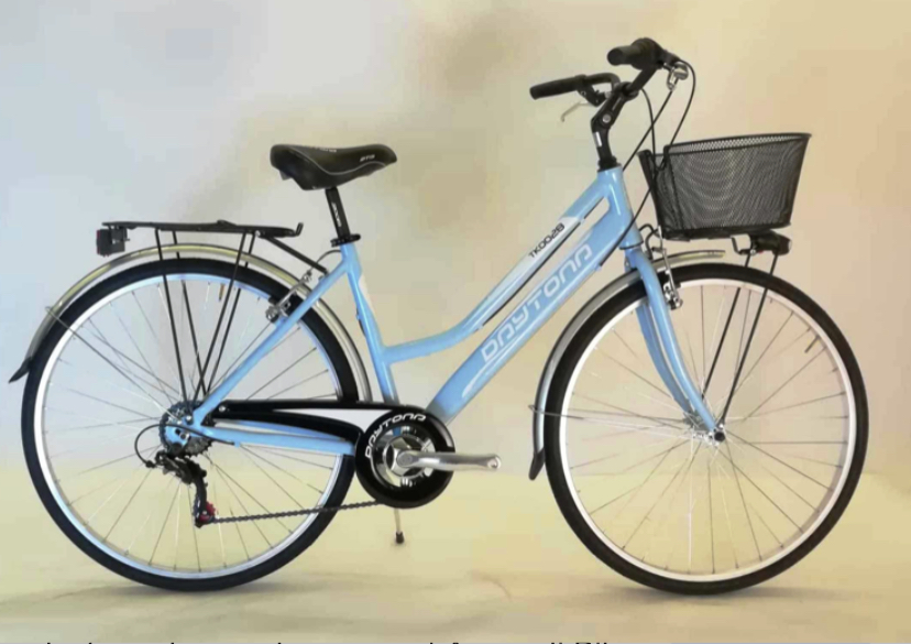 Bici nuova colore azzurro/ celeste con rifiniture argentate, cestino anteriore, cavalletto, copri catena nero lucido, fari anteriori e posteriori