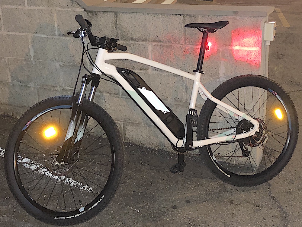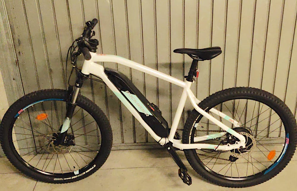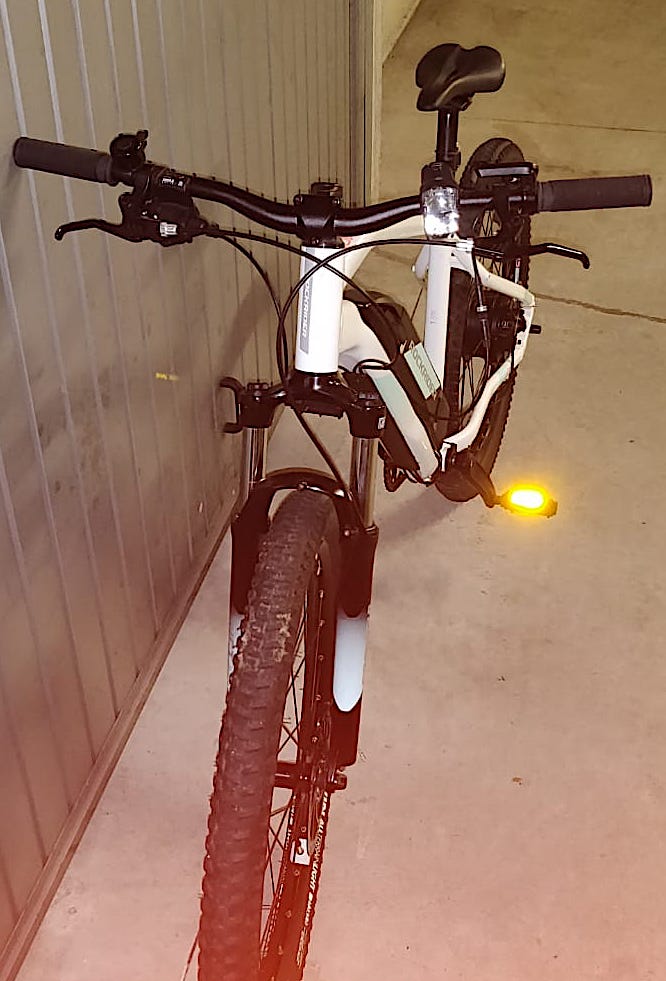 descrizione / segni particolari: Mountain bike elettrica, telaio colore bianco con batteria nera, forcella anteriore ammortizzata, freni a disc, parafango posteriore arancio fluo, graffio profondo sul tubo superiore vicino alla scritta di modello, motore n. MHLGK236V250W2825191102600 incisa al laser.