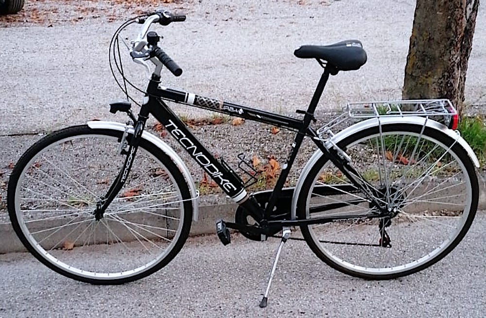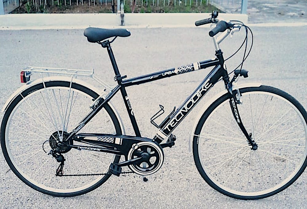 descrizione / segni particolari: bici praticamente nuova, telaio da uomo nero con le scritte TECNOBIKE e URBAN in bianco, leggerissimi segni di usura, carter catena nero, parafanghi argento, portapacchi posteriore colore argento, cambio posteriore, luci a LED anteriore e posteriore, campanello nero, cavaletto argento, portaborraccia nera