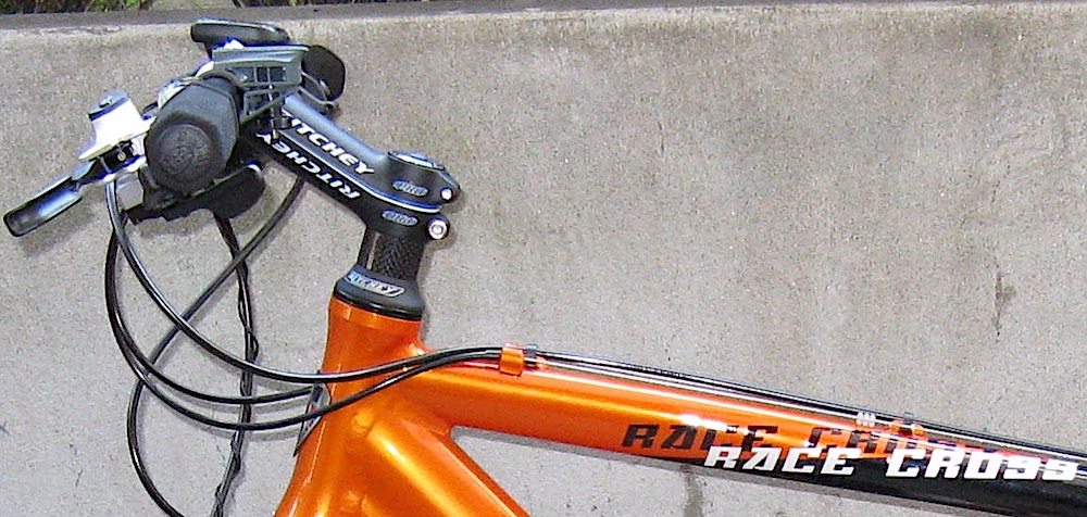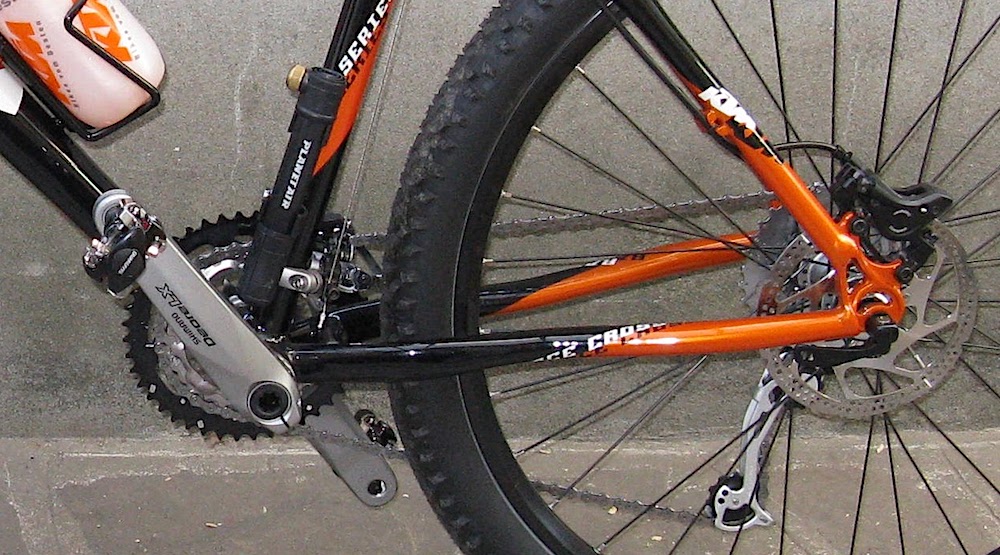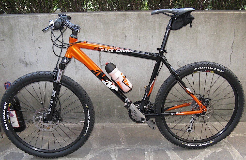 descrizione / segni particolari: mountain bike con telaio arancione e nero con le scritte KTM e RACE CROSS in nero e bianco, forcella anteriore ammortizzata marca ROCKSHOX TORA, freni a disco, attacco manubrio nero marca RITCHIE, cerchi neri MAVIC X317 Disc, copertoni SCHWALBE SMART SAM, guarnitura e pedivelle SHIMANO DEORE LX, pedali clipless per attacco scarpe