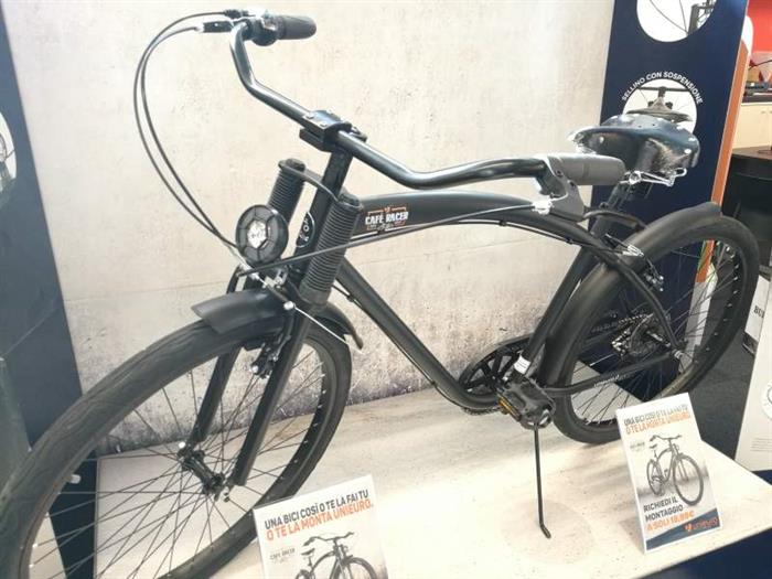 bici presa da Unieuro nel 2019, telaio nero opaco con adesivi Unieuro