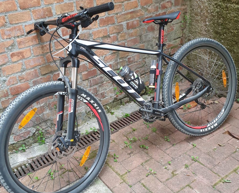 Mountain bike, telaio nero con le scritte SCOTT in bianco, forcella anteriore ammortizzata, freni a disco, sellino sbucciato nella parte posteriore sinistra, manopola sinistra consumata nella parte piu' interna
