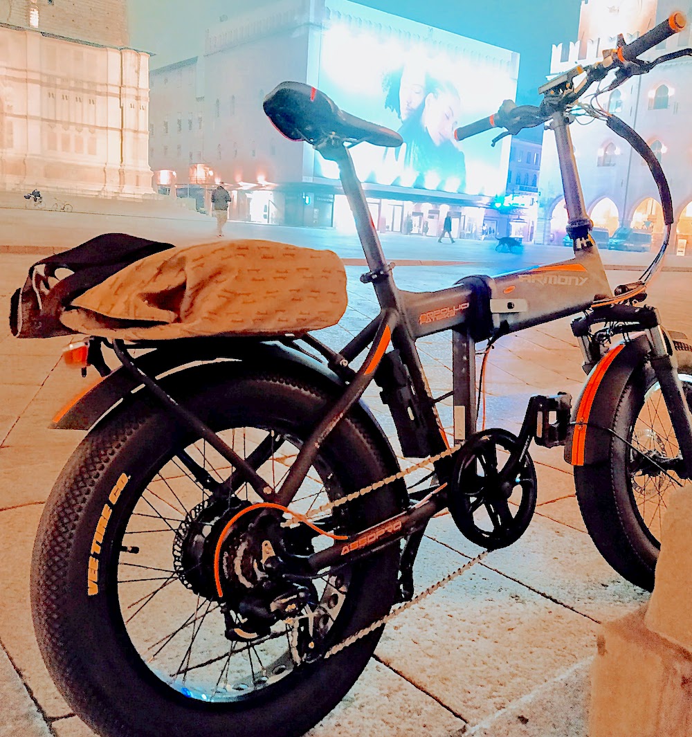 Bici pieghevole elettrica marca Armony Asso Pro, telaio nero e arancio