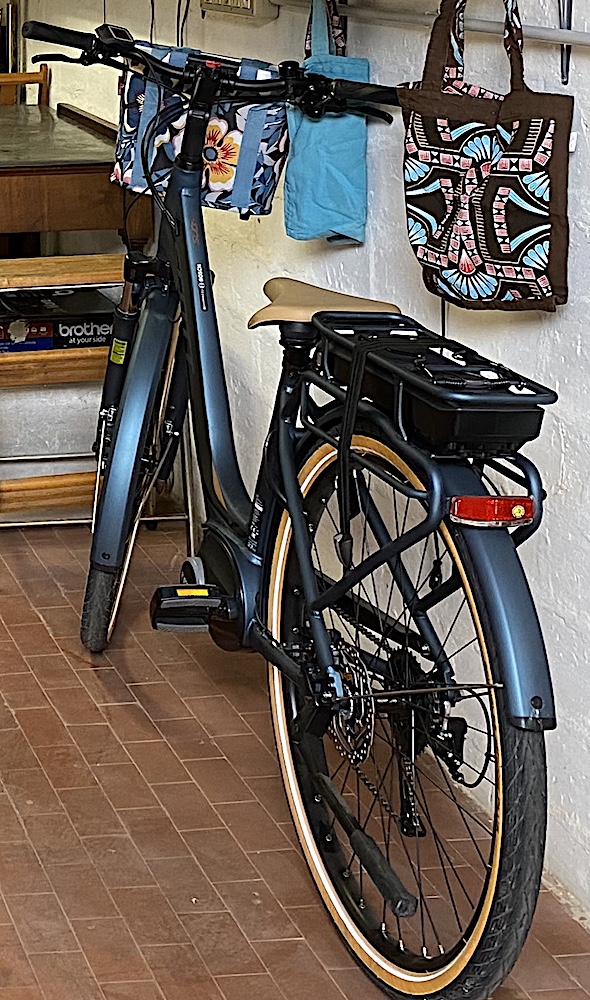Pedalata assistita, cestino a fiori, sella senape, ruote senape