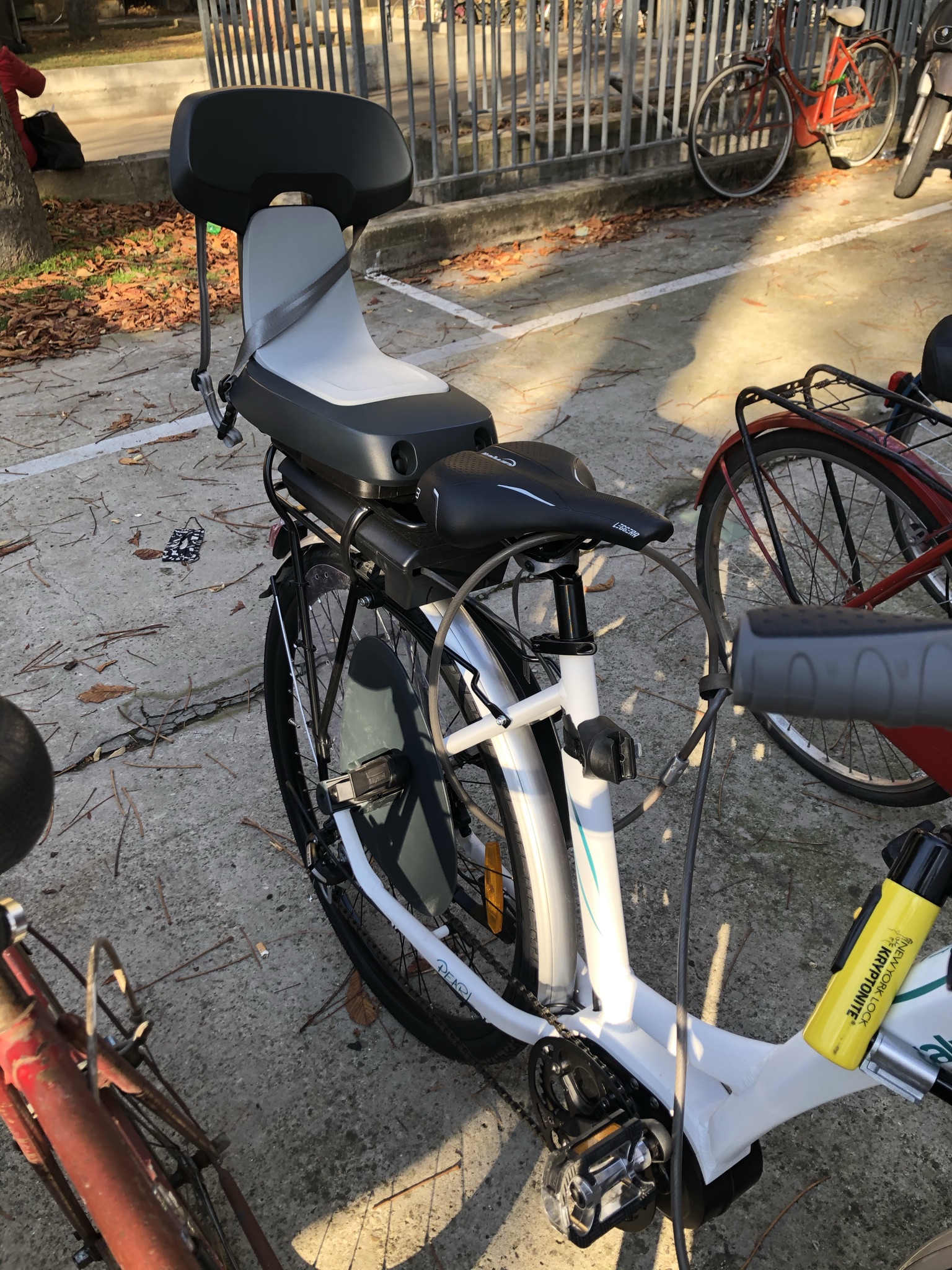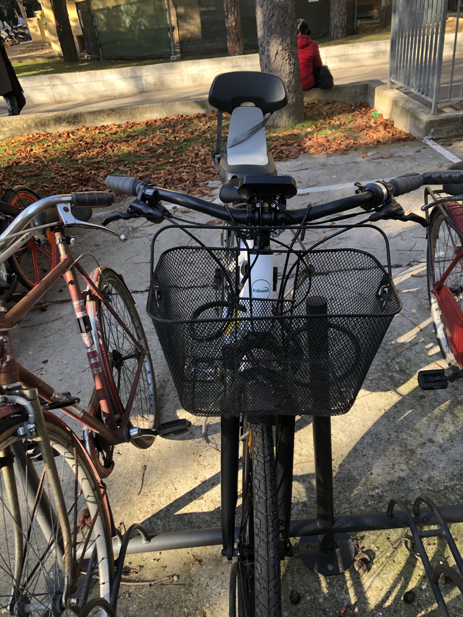 Bici elettrica, telaio da donna colore bianco scritta nera “Italwin”, ruote da 28, cestino anteriore nero e seggiolino leggero da bambino posteriore