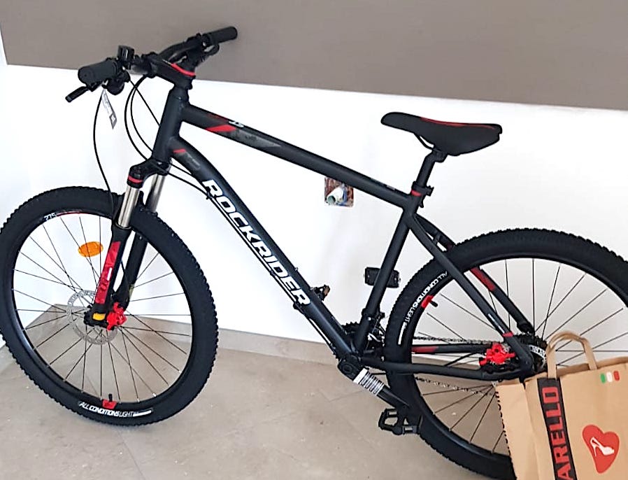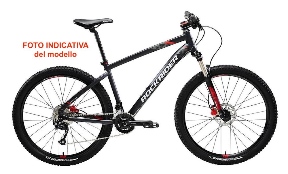 Mountain bike nuova (2021), telaio taglia XL nero e rosso con le scritte ROCKRIDER ST540, forcella anteriore ammortizzata, freni a disco idraulici, doppia corona, ruote 27,5"