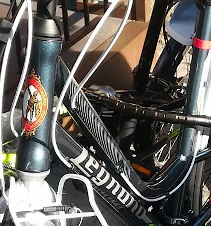 Bicicletta blu metallizzato, portapacchi bianco davanti, dietro seggiolino bambino e guaine dei freni bianche