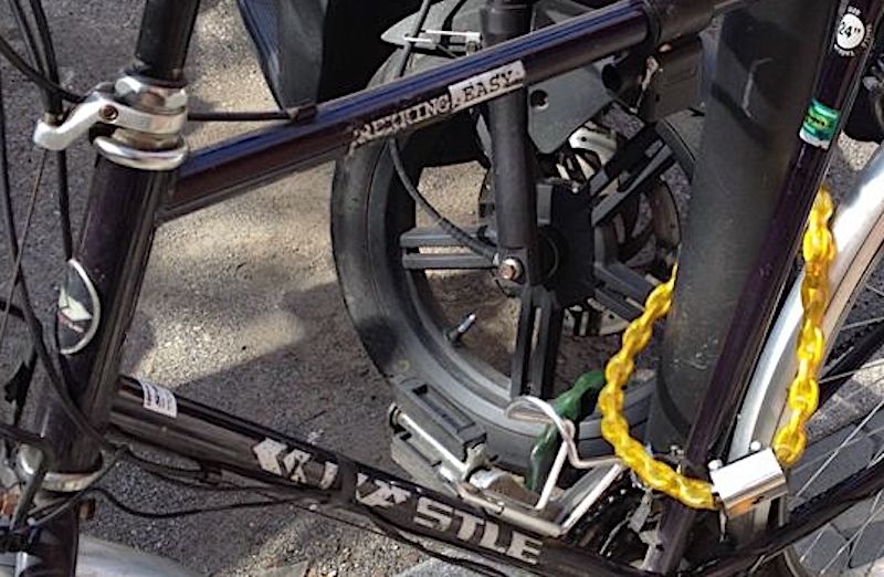 descrizione / segni particolari: City bike da uomo con doppio cambio, taglia grande (24" / 61cm), telaio blu scuro con le scritte KASTLE e EASY TREKKING in argento, attacco manubrio nero regolabile, parafanghi argento, due portapacchi, freni cantilever, cavalletto alla ruota posteriore
