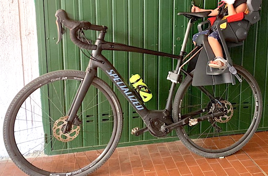 bici da corsa elettrica, telaio nero opaco con la scritta SPECIALIZED in azzurro, freni a disco, pedali a sgancio rapido, attacco seggiolino (o probabilmente segni lasciati sul tubo sella), ruote DT Swiss