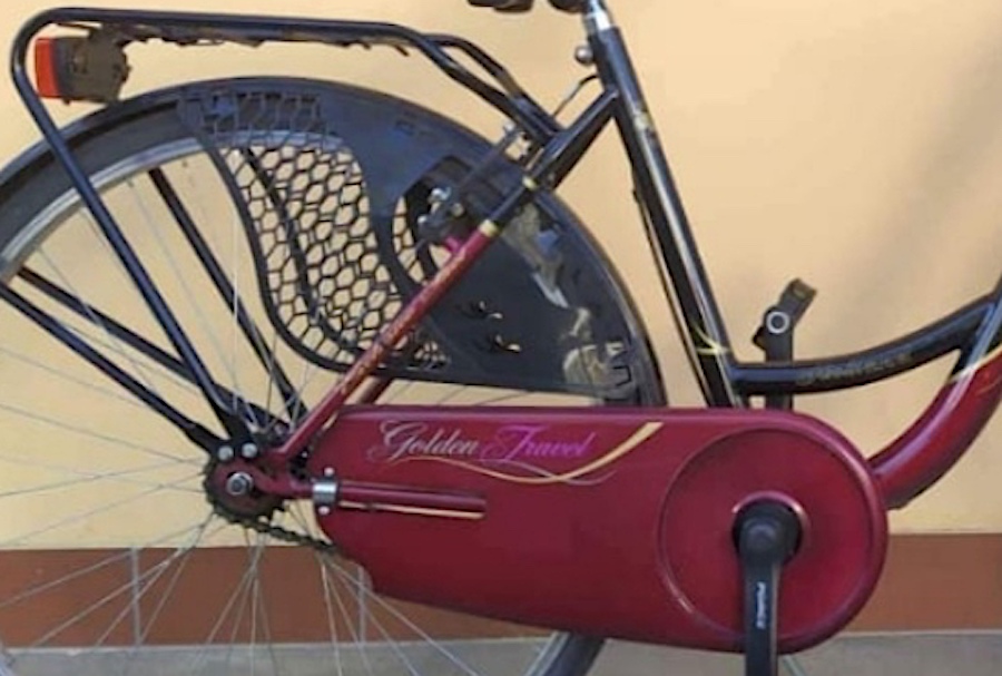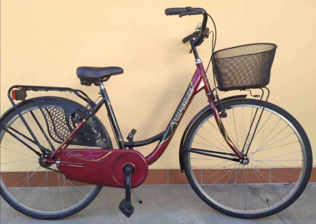 descrizione / segni particolari: City bike da donna senza cambio, telaio bordeaux tubo sella nero e con le scritte TOP BIKE e Holland e sul carter catena la scritta Golden Travel, due portapacchi nero, cestino anteriore nero, parafanghi neri, sellino nero a molla, attacco e manubrio neri