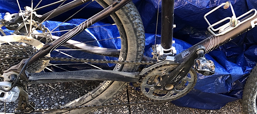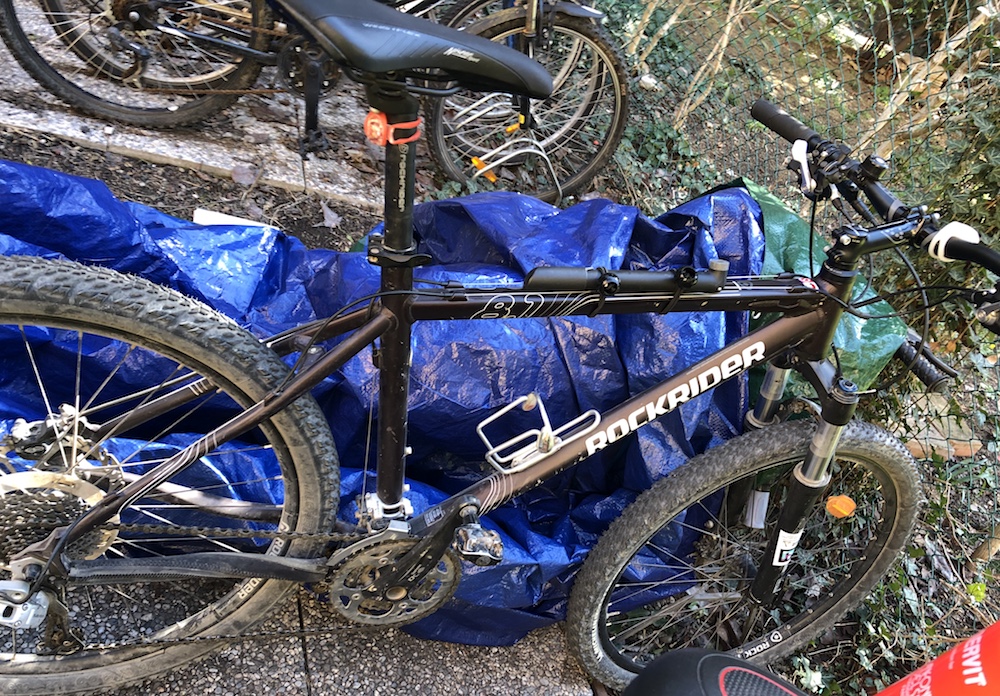Mountain bike, telaio nero con le scritte RockRider in bianco, forcella ammortizzata, freni a disco, sella marca Fizik, porta borraccia bianco marca Elite, luci, pedali con attacco scarpe