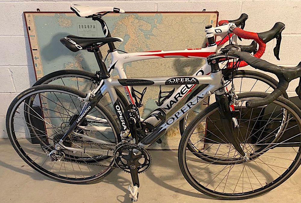 descrizione / segni particolari: Bici da corsa marca Pinarello, modello Opera Leonardo, telaio argento in alluminio misura 52 o 54, forcella nera in carbonio, Campagnolo 10v, attacco e manubrio integrato aerodinamico nero marca Cinelli, pedali bianchi da corsa tipo clipless